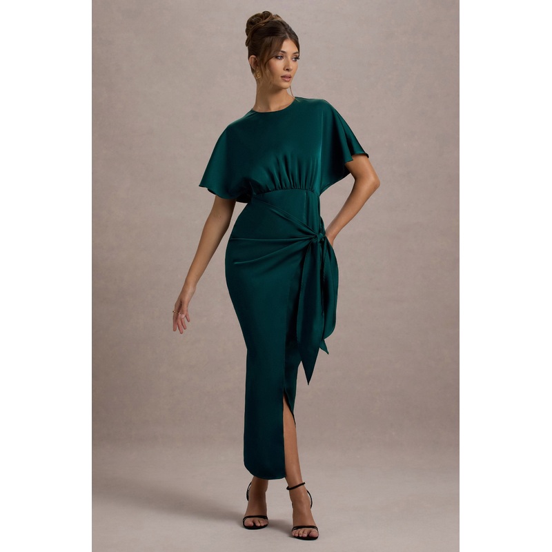 Mika | Bottle Green Satin Short-Sleeve Wrap Maxi Dress