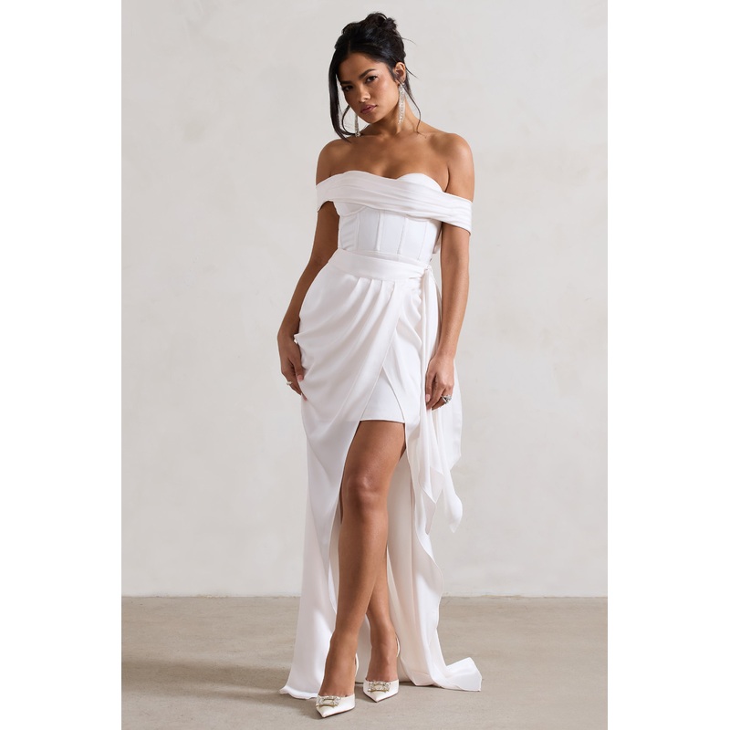 Offering a blend of classic and contemporary, our Milano maxi exudes sophistication. Arriving as a set, this versatile style boasts a satin mini dress equipped with wired padded cups and boned corset bodice for a curve-enhancing fit. Complete with a removable satin wrap skirt, Milano is the perfect pick for any event from hen to aisle.