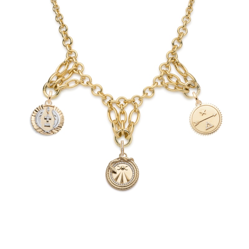 The three medallions hang elegantly on one of our newest layers, our Lattice Bib Chain Necklace, which features beautifully interlocking links that give real gravitas to your story.