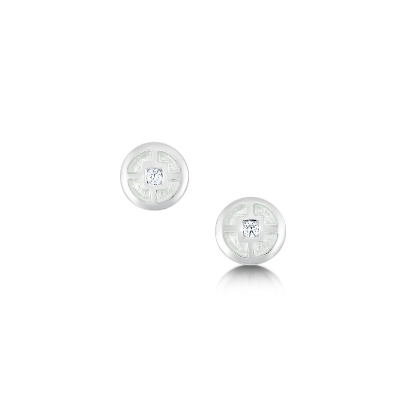These petite Mine Howe stud earrings in sterling silver feature a geometric design, inspired by Orkneys prehistory. The earrings are hand-enamelled in our workshop in Orkney and the centre of each design is enhanced with a 2mm cubic zirconia.This collectio