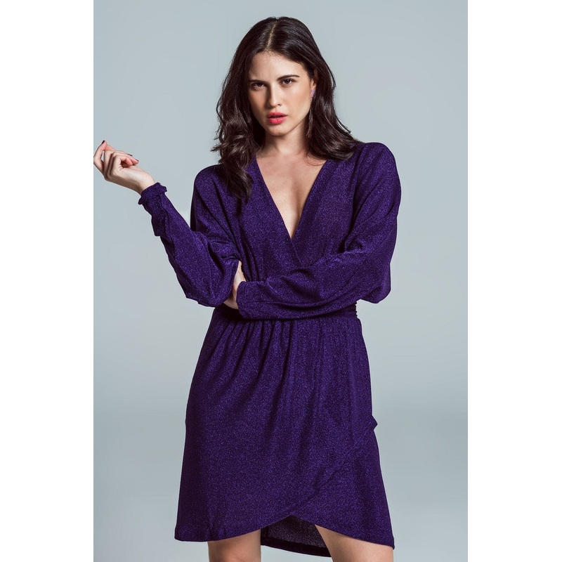 Mini Length Glitter Dress With Deep V Neck In Purple