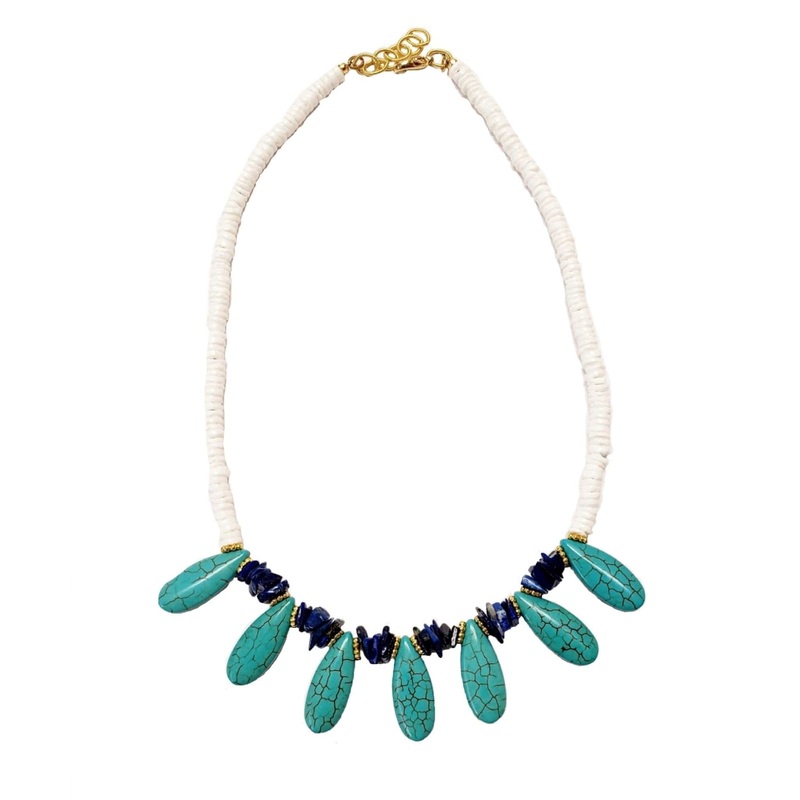 A necklace that makes a statement. Made of turquoise, lapis, shell, and gold accents. 16-18" long, adjustable.
