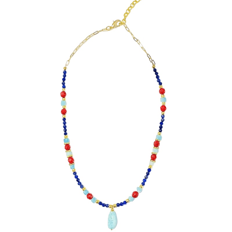 Made of beautifully cut faceted lapis, coral, and amazonite with gold accents. 16-18″ long, adjustable.