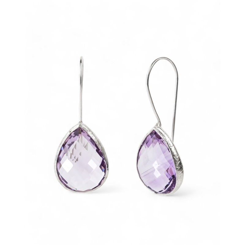 The Mirror Cut Drop Earrings feature vibrant purple amethyst stones set within a rugged, hammered silver setting.