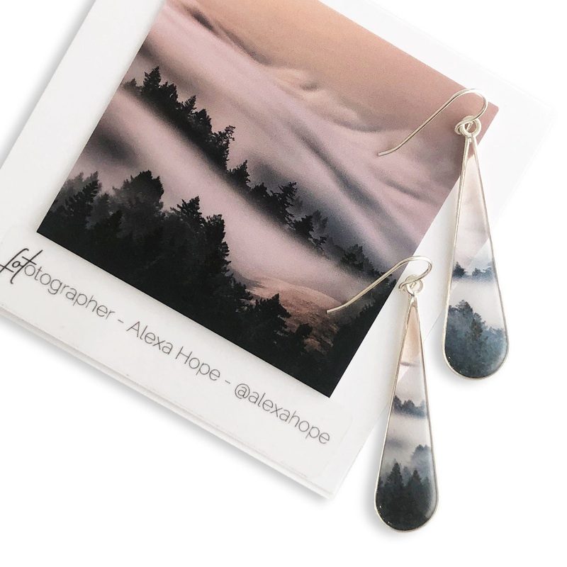 Find your bliss in the mountain mist with these misty mountain earrings! These earrings capture a photo of a quiet moment in the mountains. Perfect for that avid mountainhiker in your life.