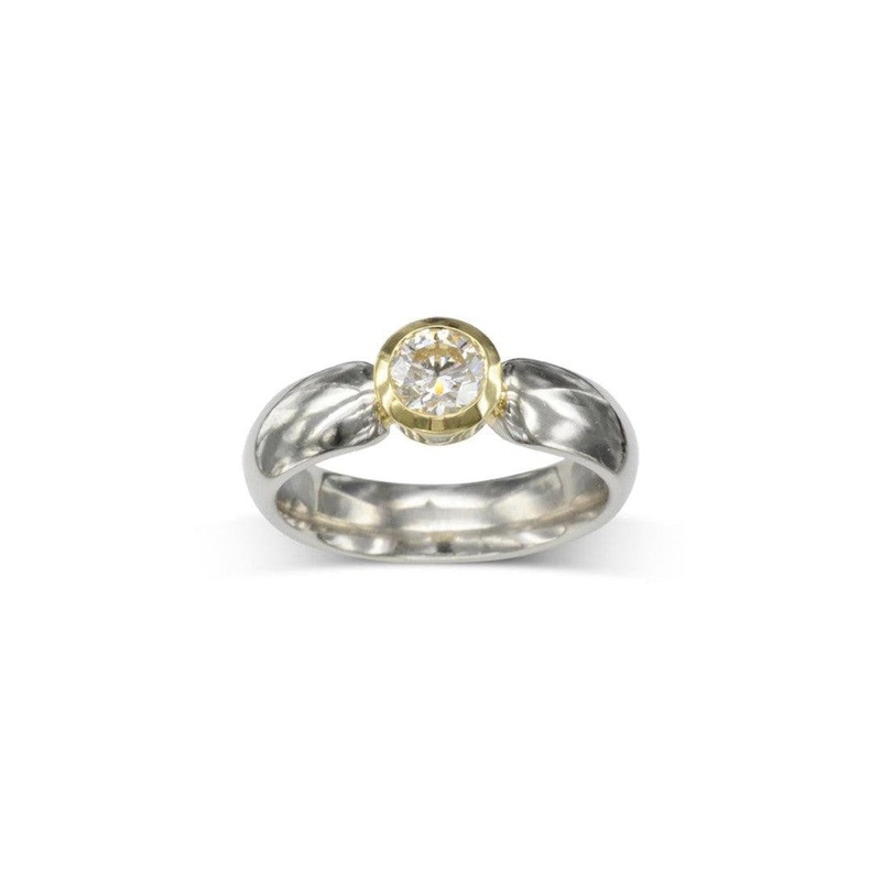 The Mixed Metal Modern Diamond Ring is well-suited for those with active lifestyles thanks to the rub-over setting that fits low to the finger.Material Options: The ring is available in white gold with a yellow gold setting, offering a beautiful contrast b