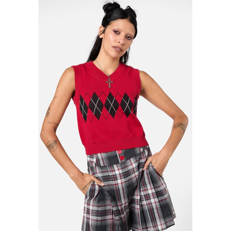 Knit Vest- Features Custom Argyle Artwork- V Neck Cut- Ribbed Hem, Sleeve Holes And Neck Line- Soft Hand Feel- Made From Cotton- Available In RedProduct Code: DGFZ222