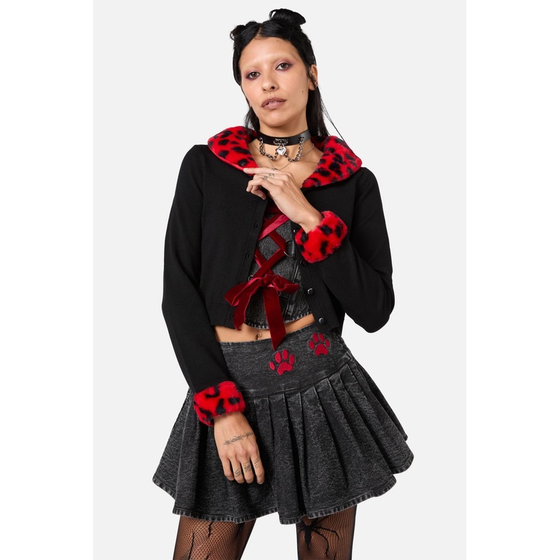Faux Fur Trim Cardigan-Features Custom Moggy Print Faux Fur Trim-Faux Fur Collar Is Detachable-Button Front-Crop Length-Stretch Fitted Cut-Long Sleeves-Made From Viscose And PBT-Available In BlackProduct Code: DGFZ220
