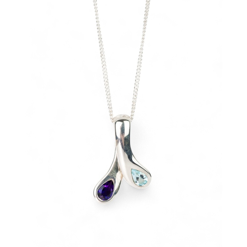 An unusual solid silver amethyst pendant with blue topaz in our popular "Moi et Toi" style. The pear shaped faceted gemstones measure 7x5mm. Thispendant has a polished finish and is approximately 26mm long. It comes with an 18" 1mm silver curb chain.It can
