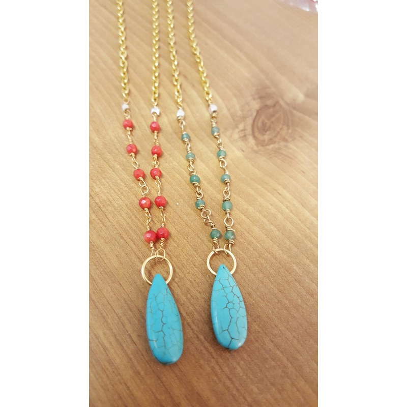 Beautiful simple necklace. Made of faceted red coral or green aventurine with turquoise magnesite on gold-plate chain.16-18 inches, adjustable.