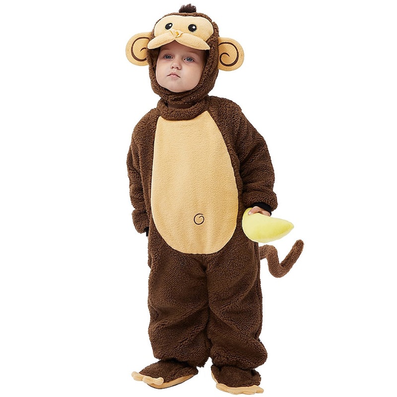 Item Includes:Jumpsuit.Hood.Booties.Banana Toy.Features:Plush brown jumpsuit with tail at the back.Plush brown monkey character hood with eyes, ears and tuft of fur.Hood has a velcro closure under the chin.Plush brown booties with anti-slip base.Plush bana