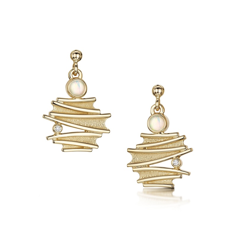 These Moonlight drop earrings in classic 9ct yellow gold feature layers of gold delicately dropping from a golden post. Each are enhanced with an opal and diamond set by hand in our Orkney workshop.A collection inspired by the moons shimmering reflection o