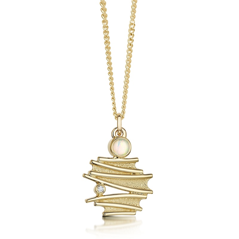 This small Moonlight pendant in classic 9ct yellow gold features a delicate design made up of layers of gold that delicately drops from a gold chain. The piece is elegantly enhanced with an opal and diamond, each set by hand in our Orkney workshop. The des