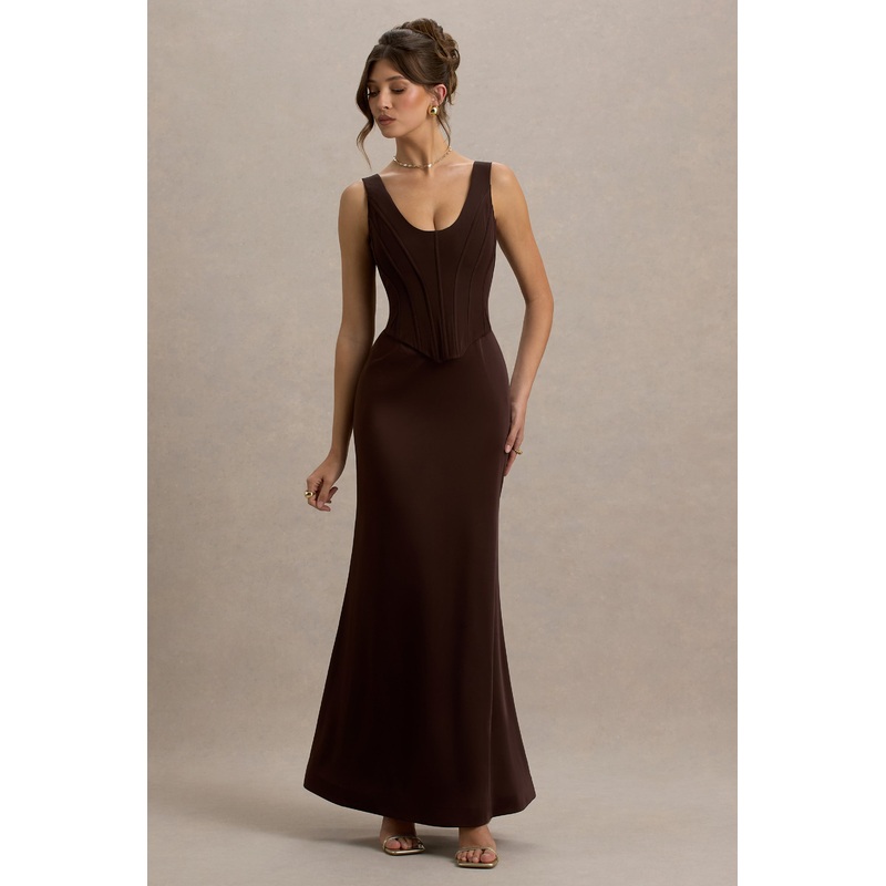 Make an entrance in Morgan, a piece that is sultry, sculpted and unapologetically glamorous. This maxi is cut from our premium stretch crepe and luxe satin, in a rich brown shade, and is designed to flatter every curve. Finished with a structured corset bodice, that gives you a gorgeous hourglass silhouette, and a daring plunge neckline, this dress exudes elegance and femininity. The bodice is contrasted beautifully with a sleek satin skirt that moves with you effortlessly, Morgan strikes the perfect balance of allure and elegance. Pair with gold accessories and a clutch bag for a showstopping look.