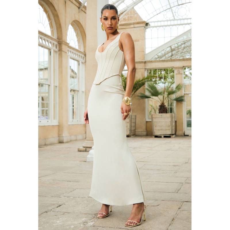 Make an entrance in Morgan, a piece that is sultry, sculpted and unapologetically glamorous. This maxi is cut from our premium stretch crepe and luxe satin, in a rich champagne shade, and is designed to flatter every curve. Finished with a structured corse