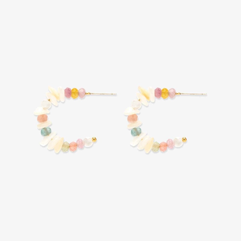 Inspired by sea glass on the coast, meet the Mother of Pearl Chip Huggies. These petite hoops feature colored raw quartz and glass beads alternating with freshwater pearls, all varying in size to create dynamic dimension.