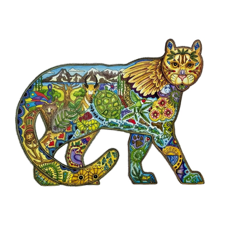 Mountain Lion is a sign of leadership and great power. Patient service to others can be found watching the ants. The spirit of the feathers is facing the good counsel of crow, and the flowers represent life ever unfolding and beautiful. Owl and bear peek o