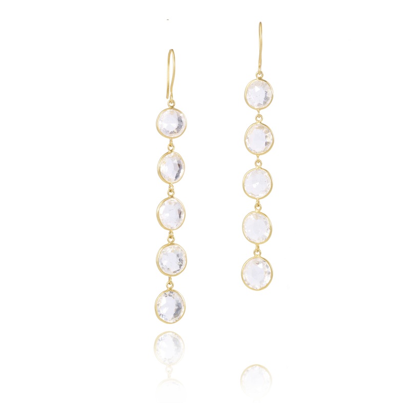 The Mughal Dreams five Drop Earrings are made of 18k yellow gold and feature crystal.These earrings were inspired by the Bejwelled Treasure exhibition at the Victoria & Albert Museum, which showed an astounding collection ofMughalgems from the Al Thani col