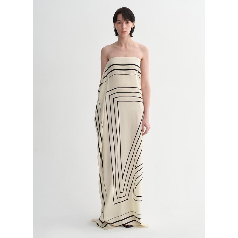 This product is made of high-quality natural mulberry silk blended with elastic spandex fibers. It’s skin-friendly, delicate, lustrous and stretchy. Designed in the shape of a silk scarf wrap, it features a bandeau style with natural vertical pleats on one side, presenting a relaxed, elegant, simple and casual look. It’s light and agile, decorated with contrasting striped prints. In the shape of a silk scarf bandeau, it showcases an elegant, confident and fashionable style.