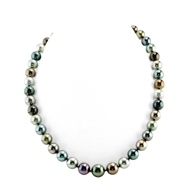 This exquisite piece of jewelry features a stunning array of colors that will catch the eye. With peacock, cherry, green, silver, and dark blue overtones, this necklace showcases a beautiful spectrum set against a pale to dark charcoal grey background. Each of the True-Round Tahitian pearls ranges from 9.0 to 11.0mm, crafted with AAAA quality. The bright luster and subtle orient of these pearls will surely bring an elegant touch to your evening attire or sophisticated daywear.