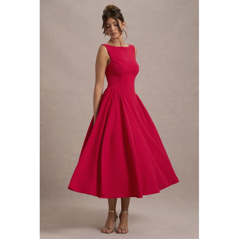 Muriel | Red Boat-Neck Volume-Hem Midi Dress