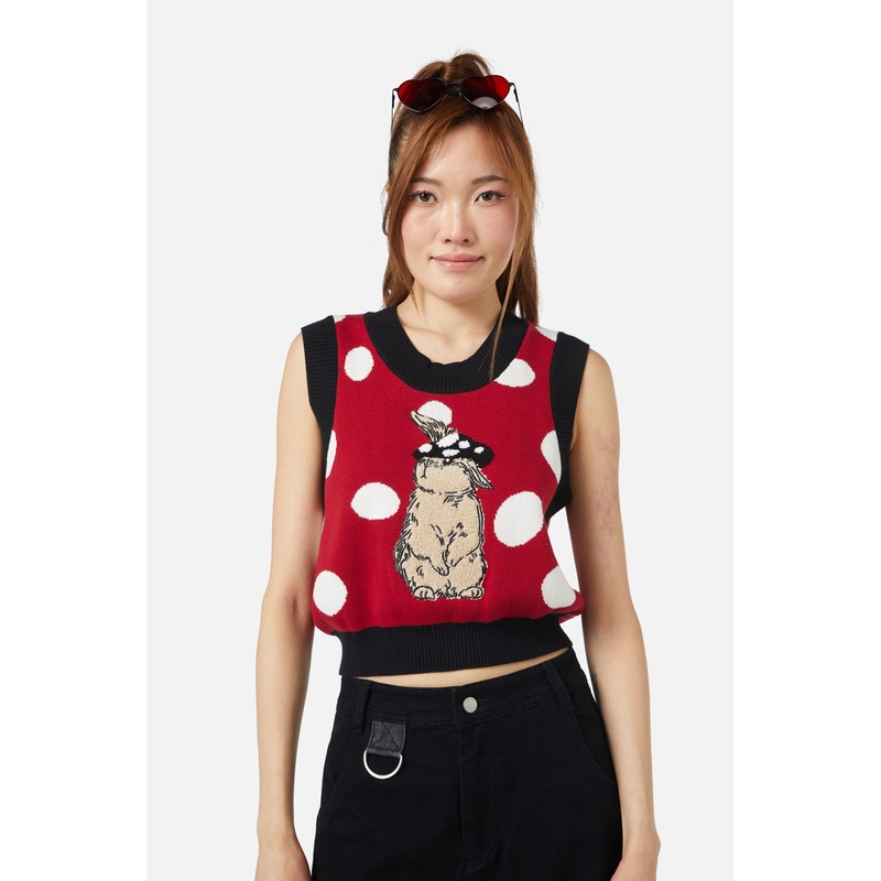 Intarsia Knit Vest-Features 'Mushroom Cap' Placement Intarsia Artwork-Full Bodice Length-Has Contrast Ribbed Neck, Hemline & Armhole-Soft Handfeel-Made From Cotton-Available In Red Product Code: DGFY241