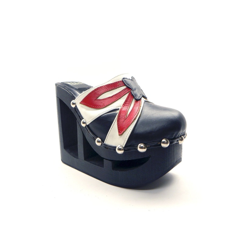 N.Y.L.A. Shoes Delly Women’s Black Wood Platform Clogs with Red & White Leather Upper