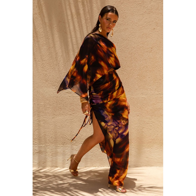 Make a striking entrance in Nadine. Crafted in a bold, smoke print of our premium chiffon, this maxi skirt skims over your curves delicately whilst sculpting your silhouette. Cut with an asymmetric waistline, that is adjustable with a functional draw cord, ensuring that this piece will flatter you from every angle. Finished with a sultry split detail, in Nadine you won’t be forgotten.