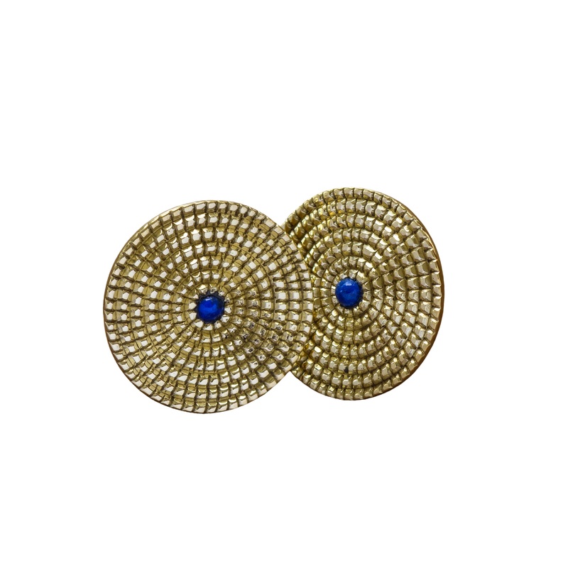 The Nagbeshar Lapis Earrings handmade in brass with a Lapis Lazuli stone centre. These unique earings are inspired by the Nagbeshar which is a nose stud worn primarily within the Rana Tharu community of south-western Nepal and neighbouring parts of India.P