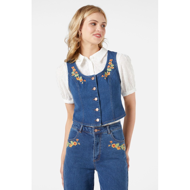 Floral embroidered denim vest, with a curved neckline and button through front. Featuring gorgeous hand painted nasturtium flowers - style as a matching set with Nasturtium emb vest and nasturtium emb jean- Nasturtium flowers embroidered along front neckli