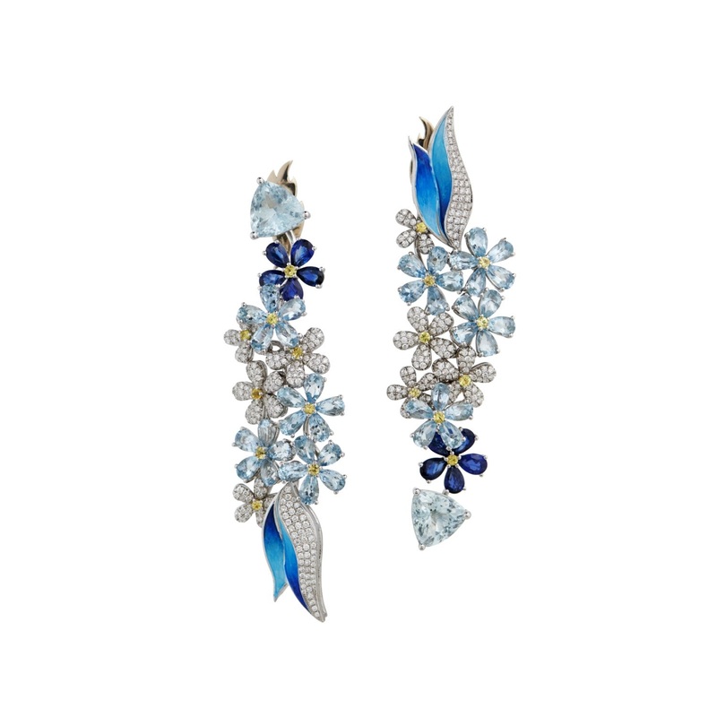 TheNatural Treasures Forget Me Not Earrings aremade from ethically and sustainably sourced18k gold, featuring white diamonds, aquamarine, and sapphires. Theminiature enamel detail has been hand painted on these stunning earringsPart of Basak Baykal'sForget