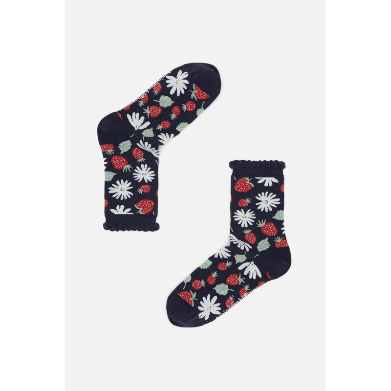 Navy La Fraise Socks- Princess Highway exclusive- A pair of sweet and pretty socks- All over design of flowers and strawberries- Available in navy- Ruffle top- Crew cut- One size with generous stretchProduct Code: PWFZ020