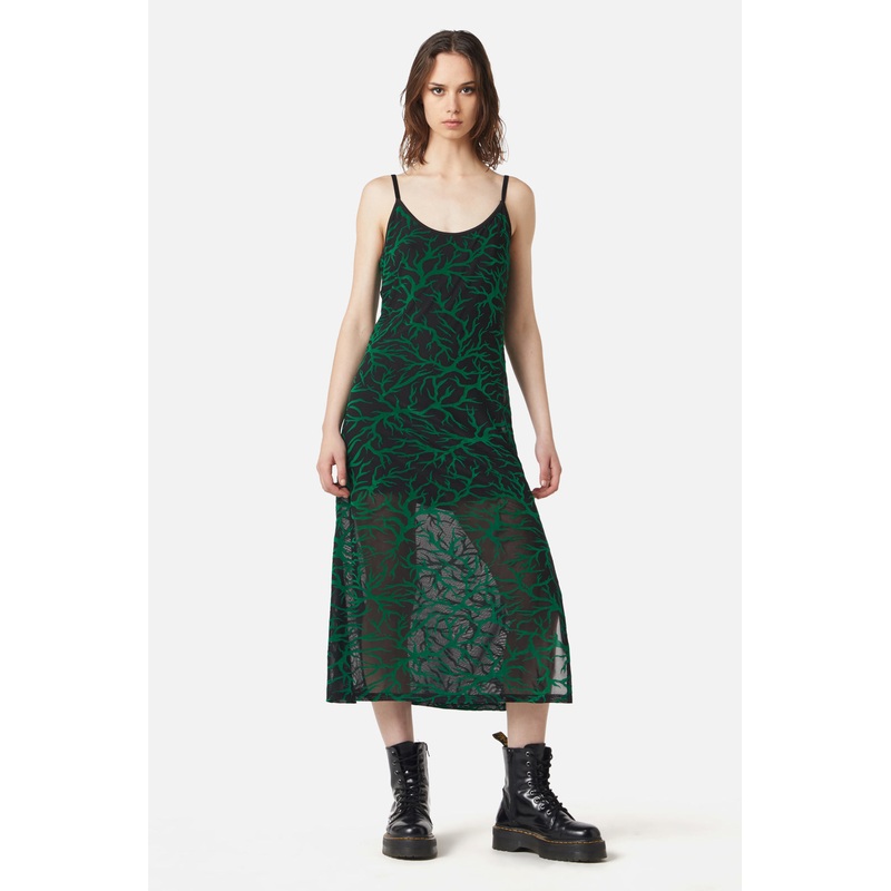 Mesh Long Dress -Features ‘Neglected’ Flocked Mesh -Bra Strap Sleeve -Side Slit -Built In Slip Style -Made From Polyester -Available In Black/Green