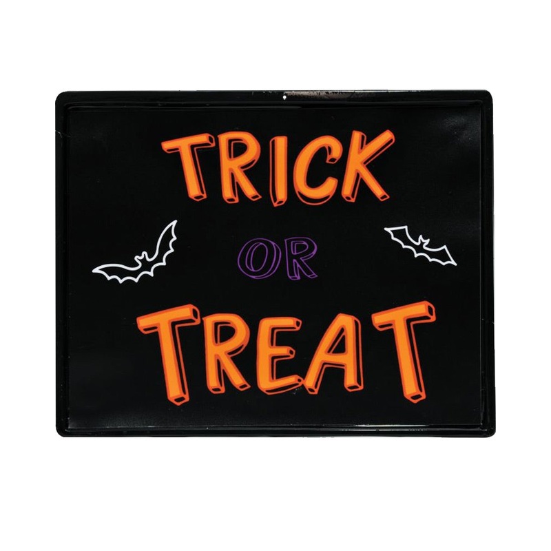 Item Includes:Sign.Sizing:21.5cm x 28cm / 8.5in x 11in.Material:Plastic.Please note: Requires 2 x AA Batteries (included).Trick or Treat.This Neon Bright Light Up Trick or Treat Sign 28cm is perfect for your next kid-friendly Halloween event. The sign is m