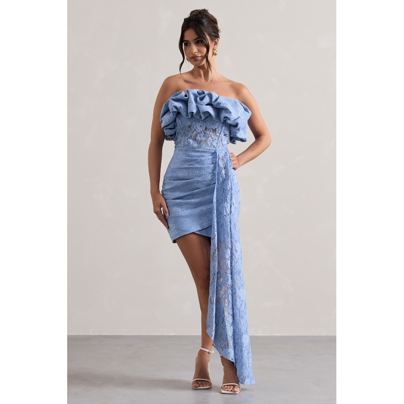 Look out of this world this wedding season in our Neptune, our aptly-named mini dress. Designed in a soft blue shade of our premium crepe, this figure-hugging piece has been carefully wrapped in a delicate lace overlay and features a ruffled neckline, boned bodice and elegantly gathered skirt. Complete with a free flowing drape, whats not to love with Neptune?