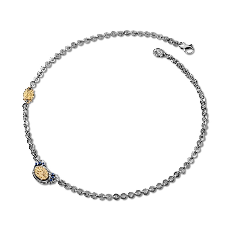 The 18kt Gold and Sterling Silver Never Apart Necklace is inscribed with ' ' 'We Shall Never Part.' Adorned with Sapphires.