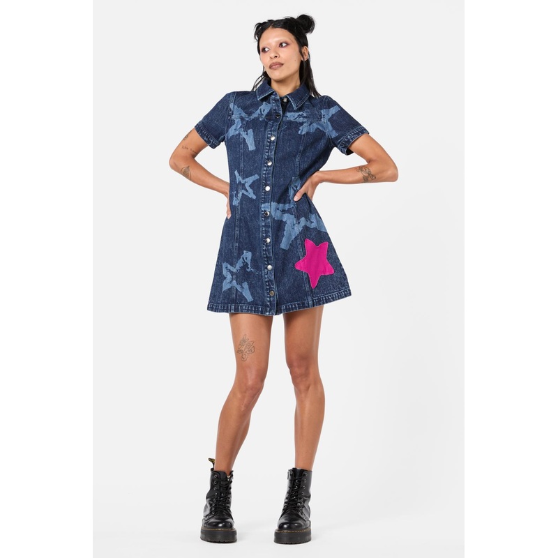 Skater Style Denim Dress- Short Sleeves- Collar At Neckline- Button Closure At Front- Semi-Fitted Shape- Bleached Star Artwork Placement On Front- Pink Distressed Star Patch On Side Front- Pockets At Sides- Made From Acid Wash Cotton/Elastane Denim- Availa