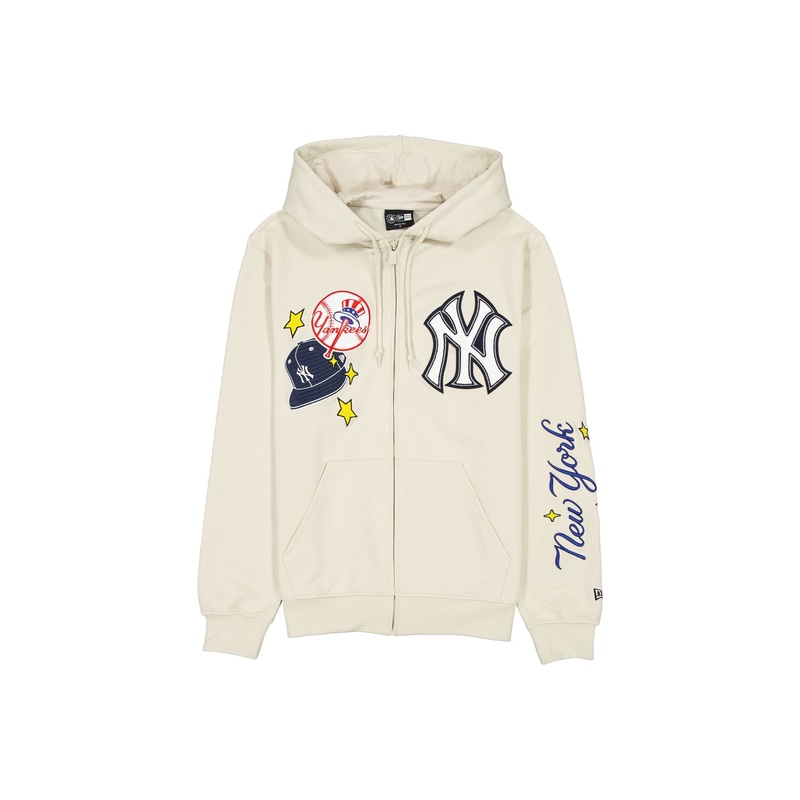 The New York Yankees Stone Logo Select Hoodie features an embroidered chenille applique Yankees logo at the left chest with an embroidered team cap and patch at the right. Additional details include a zipper closure, pockets, adjustable drawstrings at the