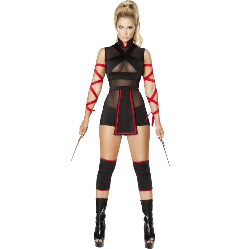 Be a fiend that strikes in the shadows with this sexy Ninja Striker Women’s Costume. The costume comes with a black romper that features sheer cutout panels across the body and a high collar. To complete the look, a black waist wrap is included with black and red front and back flaps, as well as two red arm straps to stylistically tie up your arms. Check out our other accessories and props to complete this ninja look. Perfect for Dress up parties, Ninja parties and much more.