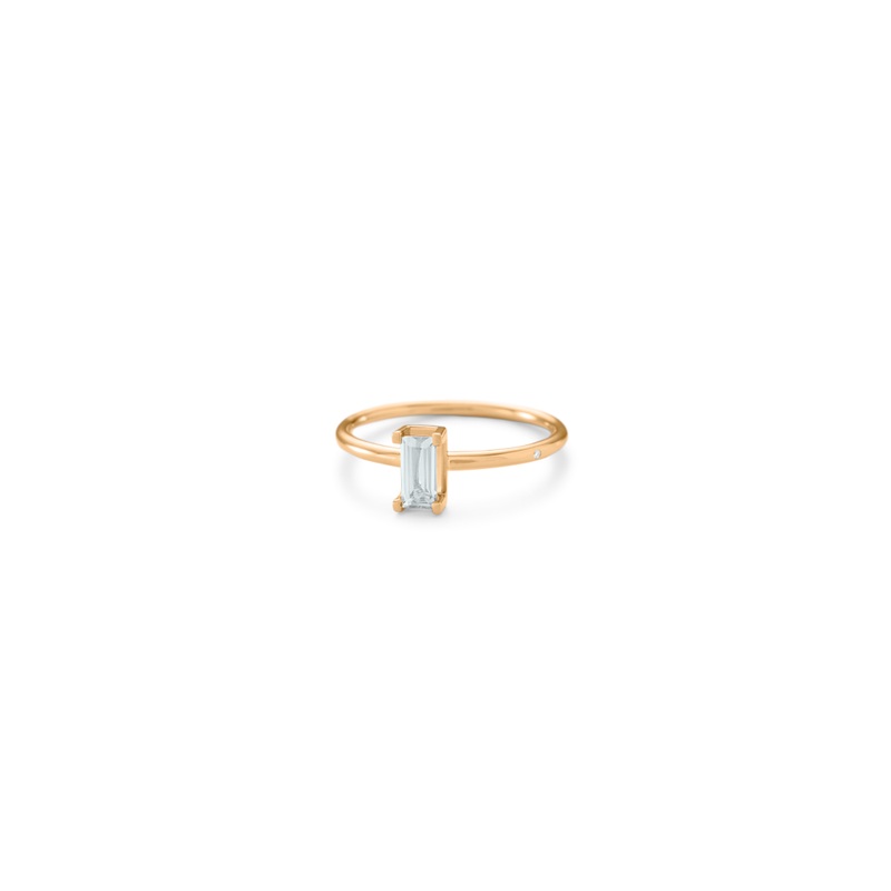 The Nord Blue Ring is made in 18kt yellow gold and is set with a baguette-cut aquamarine, it is finished with the Ro signature brilliant-cut diamond. It is a minimal design when worn alone, or combineit with other Nord rings to create a colourful and captivating geometricstack.