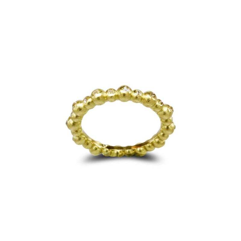 The Nugget Dainty Yellow Gold Diamond Eternity Ring is a delicate and stylish piece that combines textured nuggets with the brilliance of round brilliant diamonds.Textured Nugget Design: The alternating nuggets, each measuring 3.5mm and 2.5mm,have a slight