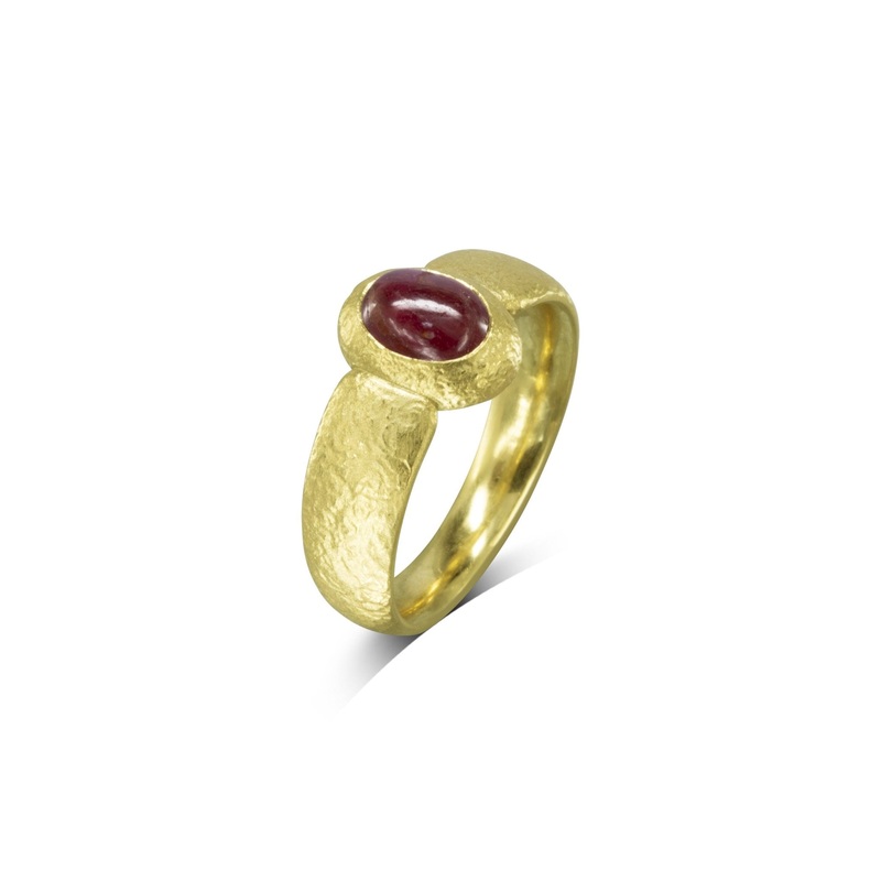 The Nugget Ruby and Yellow Gold Ring features three rubies set within a distinctive nugget-style setting. Handmade in yellow gold, this ring is a celebration of individuality and timeless beauty.RichRubies: The design showcases a stunning ruby cabochon, ca