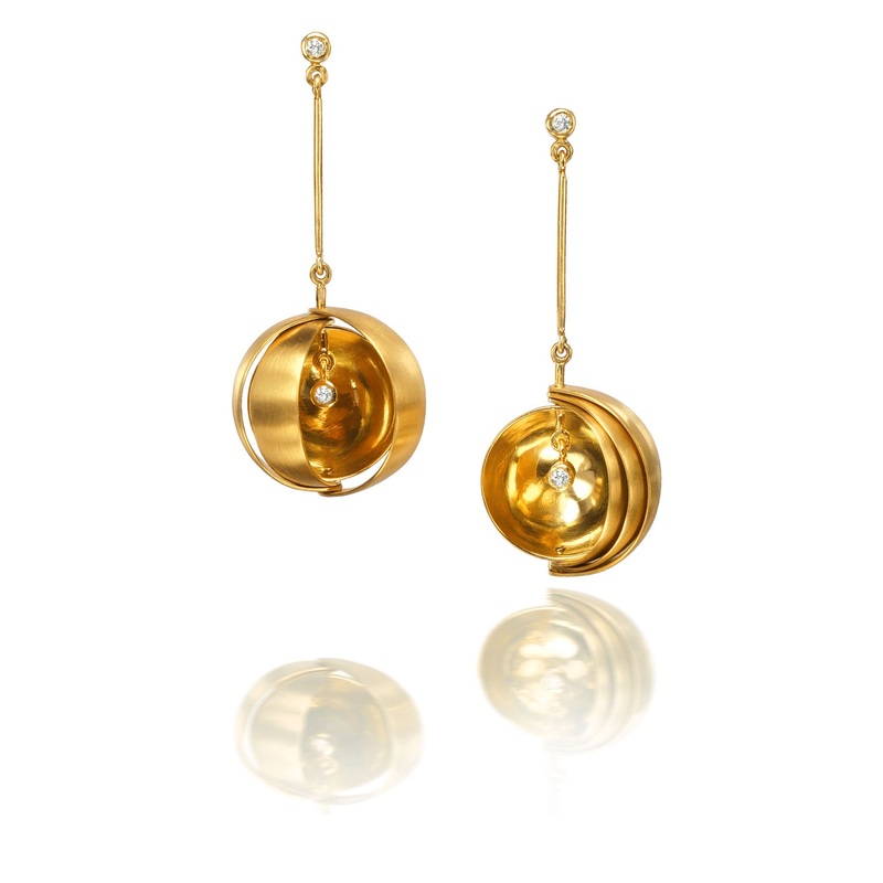 Observatory Earrings handmade by Rose Carvalho in 18ct yellow gold with diamonds.Part of the OBSERVATORIEScollection, interactive jewellery inspired by astronomical observatories, which create incredible effects on rings, earrings and pendants that open an