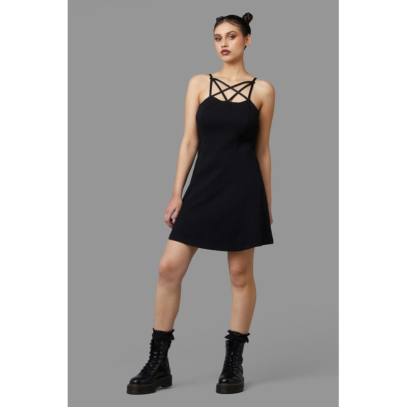 Gothic Dress- Fitted Shape Bodice- Flared Skirt- Pentagram Style Elastic Strap Detail On Chest- Spaghetti Straps- Made From Soft Cotton Jersey- Available In BlackProduct Code: BGFW227