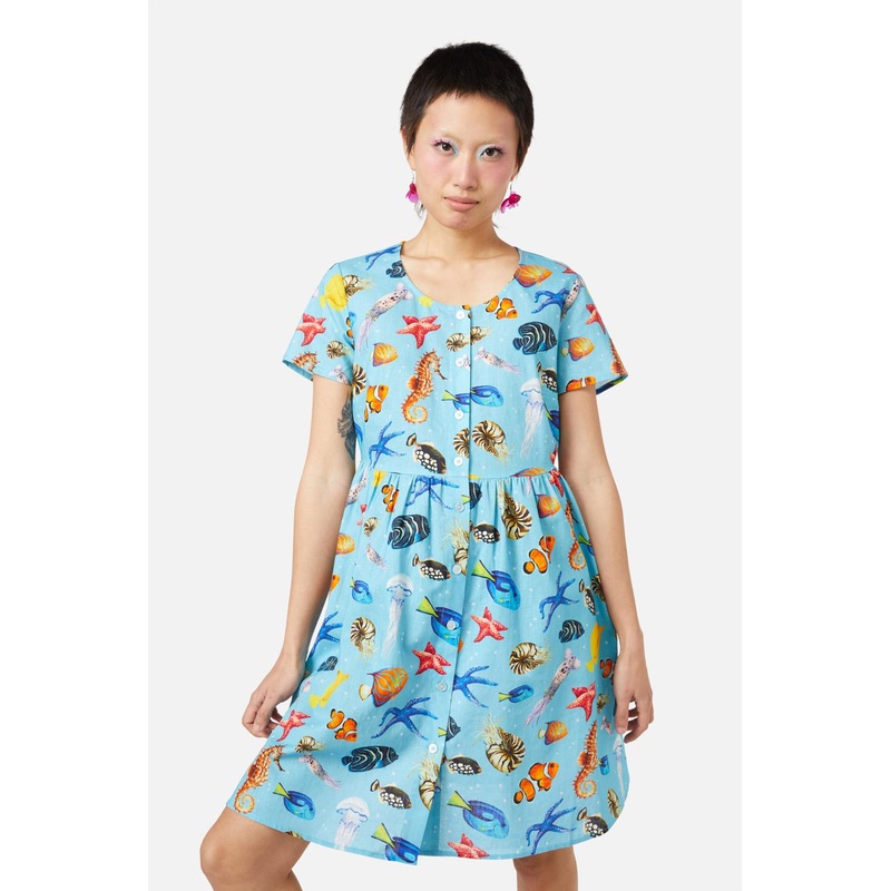 Printed Dress-Features ‘Oceanic’ Repeat Artwork-Button Front-Flowy Skirt-Round Neckline-Made From Cotton Linen Blend-Available In Blue