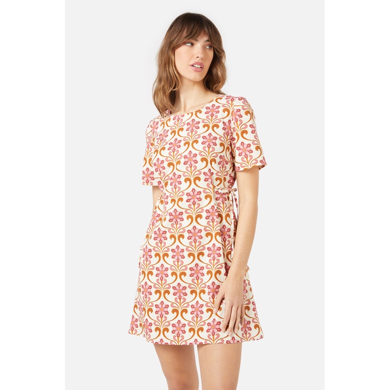 70's inspired retro wallpaper printed shift dress featuring sides ties and a round neckline- short sleeves- round neckline- length finished above the knee- relaxed fit through the body with waist darts for shaping- ties on each side of waist- handy side se