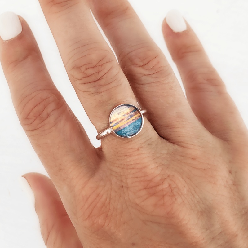 Capturing the stunning beauty of a sunset over calm water, our Oh To BeStacking Ring will bring a unique but subtle flair to any outfit. This photo jewelry piece is made of sterling silver, offering the right balance of durability and luster. This handmade ringfeatures an original photo embedded in resin for waterproofing and durability.