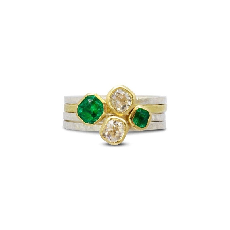 The Old Cut Diamond and Emerald Stacking Rings features 18ct yellow and platinum rough hammered metals, breathing fresh vitality into enchanting old-cut diamonds and Brazilian emeralds.