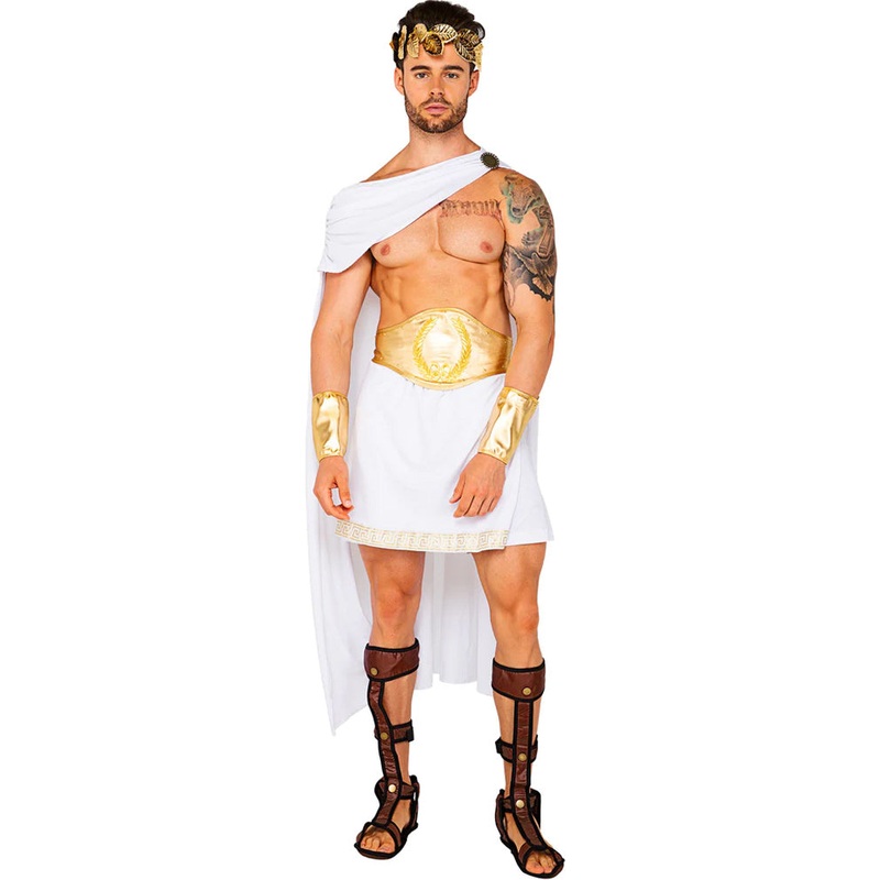 Reign over all in Mount Olympus in this striking Olympic God Mens Costume. The costume comes with a white one-shouldered cape that drapes down the back, a matching white toga-style skirt with gold trimming, a gold belt to wear over the skirt and two matching gold wrist cuffs. Finish off the look with a laurel leaf headpiece and some sandals and get ready to rule mortals as the mighty Zeus. Perfect for Greek parties, Themed parties and much more.