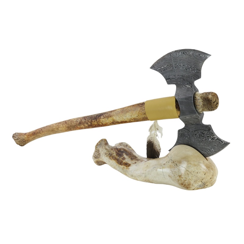 Walrus Oosik is the baculum or penile boneGenuine Damascus Steel Double sided AxGenuine Walrus Jawbone Stand IncludedLeather Sheaths IncludedSize - 23 LengthOne of a kind*